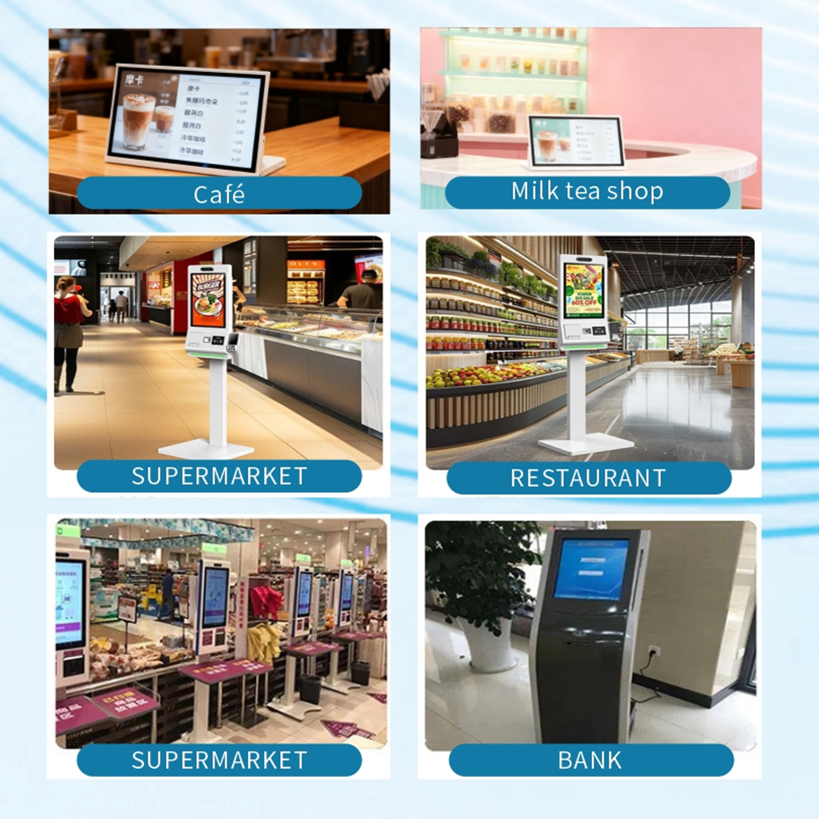 Flexible installation for restaurants, retail counters, reception areas, and self-service zones.